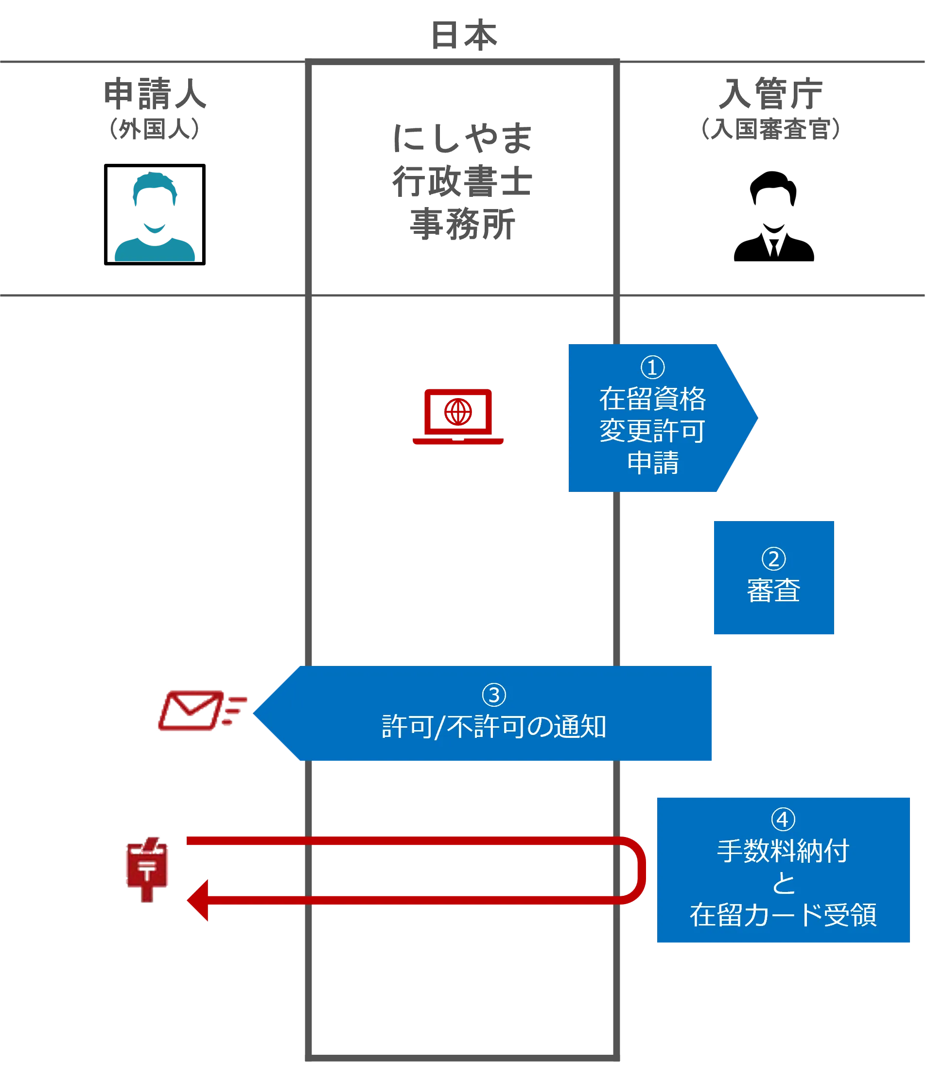 にしやま行政書士事務所では、在留申請・在留資格のオンライン申請を全国対応でサポートしています。入管実務に精通した行政書士が、複雑な手続きもわかりやすく丁寧にご案内。外国人ご本人はもちろん、企業のご担当者様も安心してご相談いただけます。